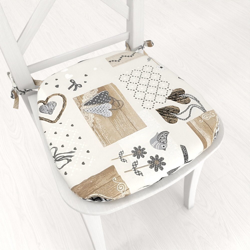 Oblý podsedák se vzorem hnědo-šedých vintage srdcí na krémovém podkladu. Potah je ušitý z kvalitní a pevné látky Porto z 55% bavlny a 45% polyesteru o gramáži 190 g/m2. Užší strana podsedáku je opatřena praktickými vázacími šňůrkami v dekoru látky. Výplň podsedáku tvoří kvalitní a tuhý molitanový korpus o tloušťce 3 cm, který je pevně všitý. Potah není snímatelný a výplň nelze z podsedáku vyjmout....