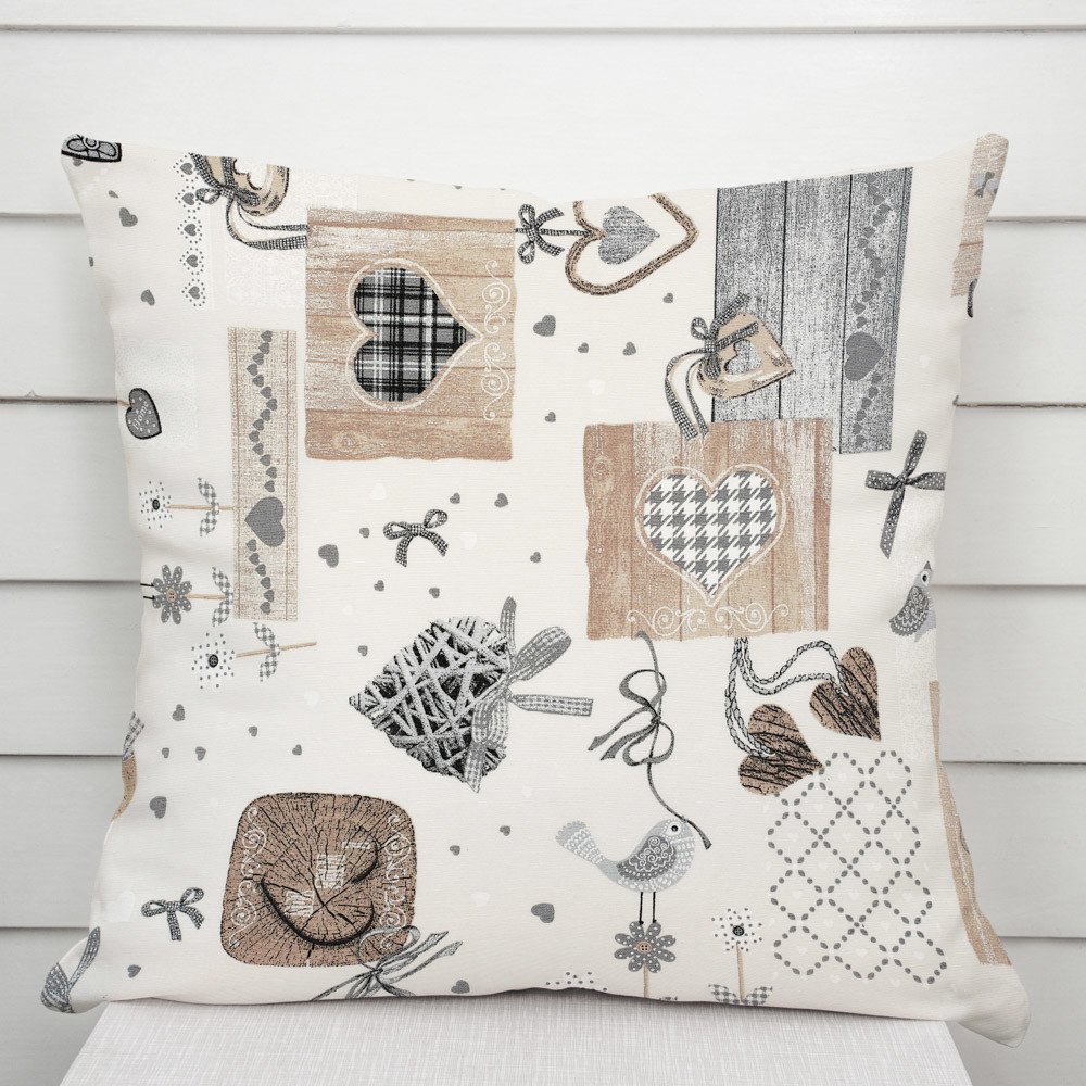 Dekorační povlak na polštář se vzorem hnědo-šedých vintage srdcí na krémovém podkladu. Je ušitý z kvalitní a pevné látky z 55% bavlny a 45% polyesteru. Gramáž látky je 190 g/m2. Zapínání na zip je skryté na spodní straně povlaku a neruší tak jeho celkový vzhled.
