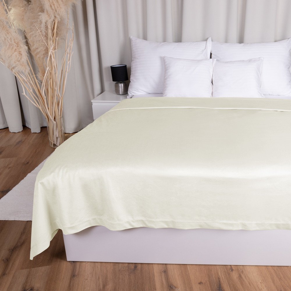 Sametový přehoz na postel v smetanové barvě, vyrobený z luxusní sametové látky prémiové řady Velvet Premium o vysoké gramáži 300 g/m2. Látka Samet Velvet Premium je utkaná z jemných polyesterových vláken a na dotek je velmi příjemná a semišově hebká. Její přirozený lesk dodává výrobkům elegantní a luxusní vzhled. Přehoz je obšitý širokým lemem 5 cm - viz. detailní foto.