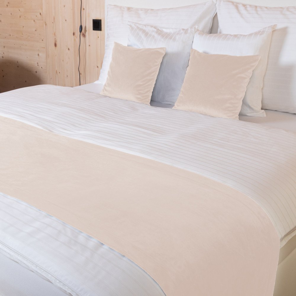 Sametový přehoz/běhoun na postel v béžové barvě, vyrobený z luxusní sametové látky prémiové řady Velvet Premium o vysoké gramáži 300 g/m2. Látka Samet Velvet Premium je utkaná z jemných polyesterových vláken a na dotek je velmi příjemná a semišově hebká. Její přirozený lesk dodává výrobkům elegantní a luxusní vzhled. Přehoz je obšitý širokým lemem 5 cm - viz. detailní foto.