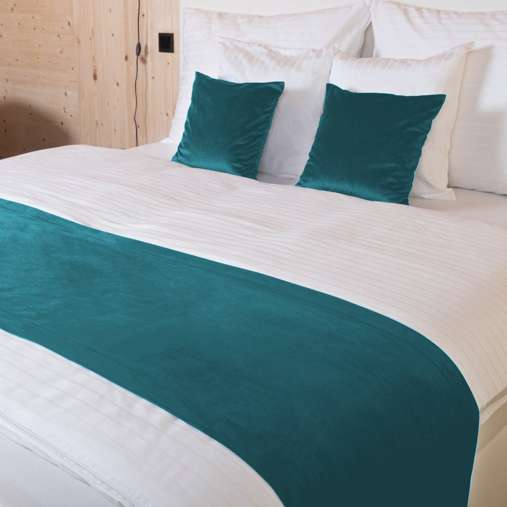 Sametový přehoz/běhoun na postel v tyrkysově modré barvě, vyrobený z luxusní sametové látky prémiové řady Velvet Premium o vysoké gramáži 300 g/m2. Látka Samet Velvet Premium je utkaná z jemných polyesterových vláken a na dotek je velmi příjemná a semišově hebká. Její přirozený lesk dodává výrobkům elegantní a luxusní vzhled. Přehoz je obšitý širokým lemem 5 cm - viz. detailní foto.