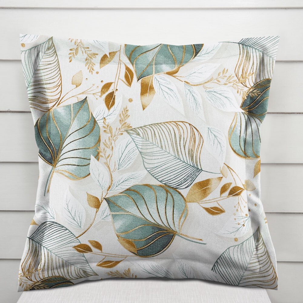 Dekorační povlak na polštář s ozdobným lemem, se vzorem zelených a khaki hnědých listů na režném podkladu. Je ušitý z kvalitní a pevné španělské látky z 55% bavlny a 45% polyesteru. Zapínání na zip je skryté na spodní straně povlaku a neruší tak jeho celkový vzhled.