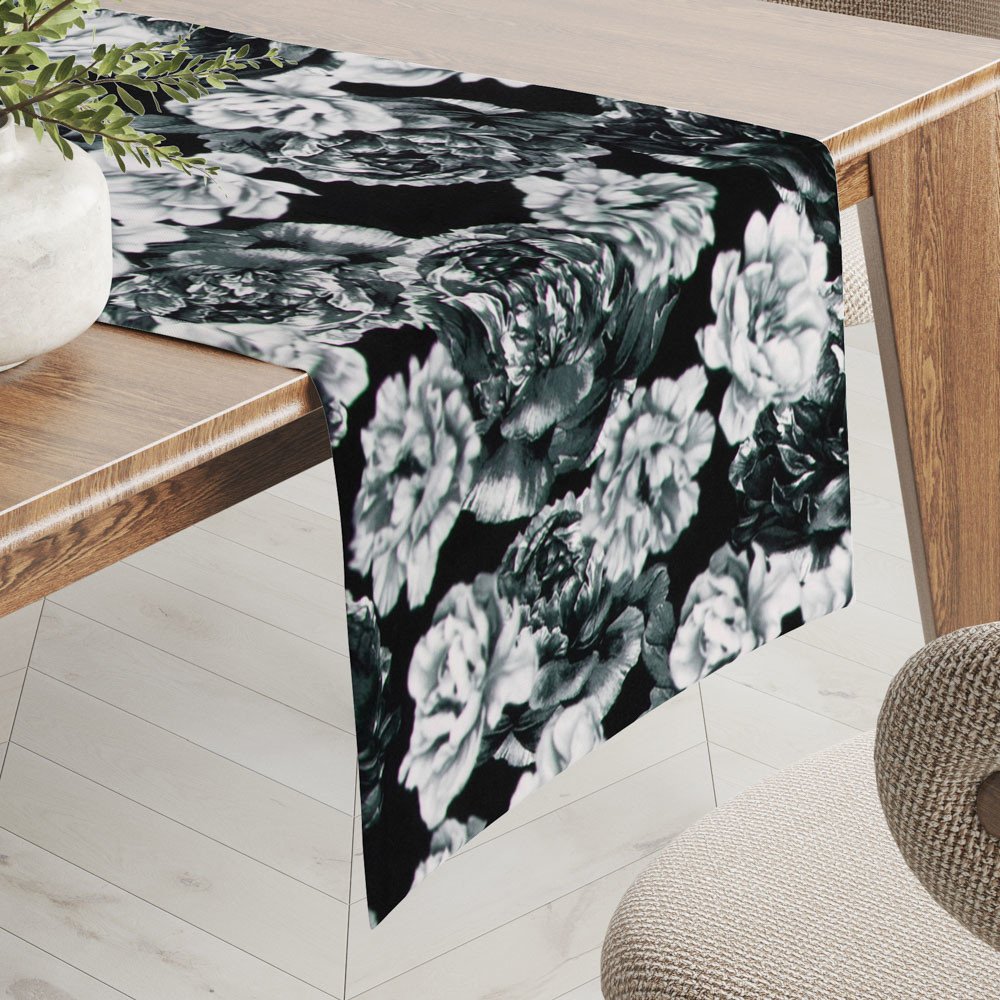 Dekorační běhoun na jídelní stůl, vyrobený z hebké a příjemné sametové látky Tamara s digitálním tiskem, se vzorem černo-bílých pivoněk na černém podkladu. Látka Tamara je vyrobena ze 100% polyesteru, o gramáži 220 g/m2.