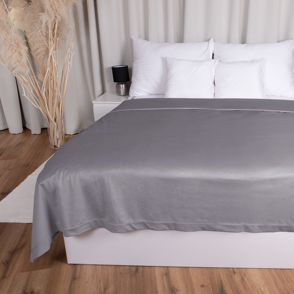 Sametový přehoz na postel v šedé barvě, vyrobený z luxusní sametové látky prémiové řady Velvet Premium o vysoké gramáži 300 g/m2. Látka Samet Velvet Premium je utkaná z jemných polyesterových vláken a na dotek je velmi příjemná a semišově hebká. Její přirozený lesk dodává výrobkům elegantní a luxusní vzhled. Přehoz je obšitý širokým lemem 5 cm - viz. detailní foto.