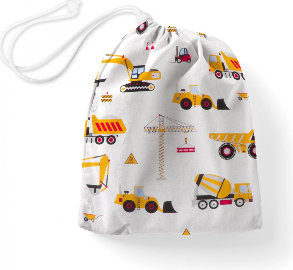 Bavlněný pytlík/sáček na přezůvky, se vzorem nákladních aut, bagrů, jeřábů a stavebních strojů na bílém podkladu. Je ušitý z kvalitního hustě tkaného 100% bavlněného plátna s certifikátem zdravotní nezávadnosti Oeko-Tex 100.Stahování je na šňůrku se zajišťovací brzdičkou. Rozměr pytlíku je cca 30×40 cm.