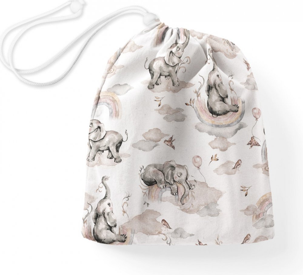 Bavlněný pytlík/sáček na přezůvky, s milým dětským motivem slonů s šedohnědou duhou na bílém podkladu. Je ušitý z kvalitního hustě tkaného 100% bavlněného plátna s certifikátem zdravotní nezávadnosti Oeko-Tex 100.Stahování je na šňůrku se zajišťovací brzdičkou. Rozměr pytlíku je cca 30×40 cm.