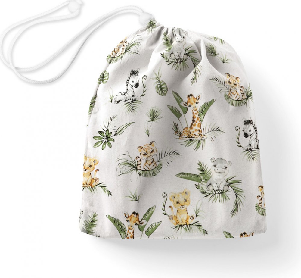 Bavlněný pytlík/sáček na přezůvky, s milým dětským motivem zvířátek v Safari na bílém podkladu. Je ušitý z kvalitního hustě tkaného 100% bavlněného plátna s certifikátem zdravotní nezávadnosti Oeko-Tex 100.Stahování je na šňůrku se zajišťovací brzdičkou. Rozměr pytlíku je cca 30×40 cm.