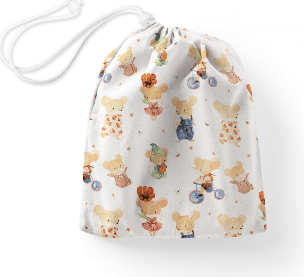 Bavlněný pytlík/sáček na přezůvky, s milým dětským motivem hravých myšek na bílém podkladu. Je ušitý z kvalitního hustě tkaného 100% bavlněného plátna s certifikátem zdravotní nezávadnosti Oeko-Tex 100.Stahování je na šňůrku se zajišťovací brzdičkou. Rozměr pytlíku je cca 30×40 cm.