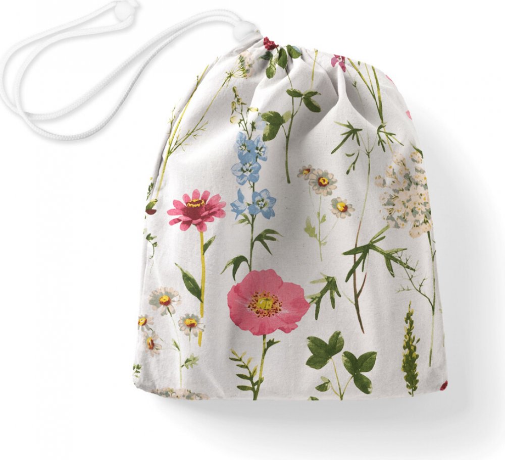 Bavlněný pytlík/sáček na přezůvky, se vzorem velkých lučních květin na bílém podkladu. Je ušitý z kvalitního hustě tkaného 100% bavlněného plátna s certifikátem zdravotní nezávadnosti Oeko-Tex 100.Stahování je na šňůrku se zajišťovací brzdičkou. Rozměr pytlíku je cca 30×40 cm.