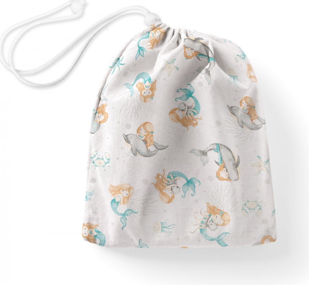 Bavlněný pytlík/sáček na přezůvky, s milým dětským motivem modrozelených mořských panen s delfíny a velrybami na bílém podkladu. Je ušitý z kvalitního hustě tkaného 100% bavlněného plátna s certifikátem zdravotní nezávadnosti Oeko-Tex 100.Stahování je na šňůrku se zajišťovací brzdičkou. Rozměr pytlíku je cca 30×40 cm.