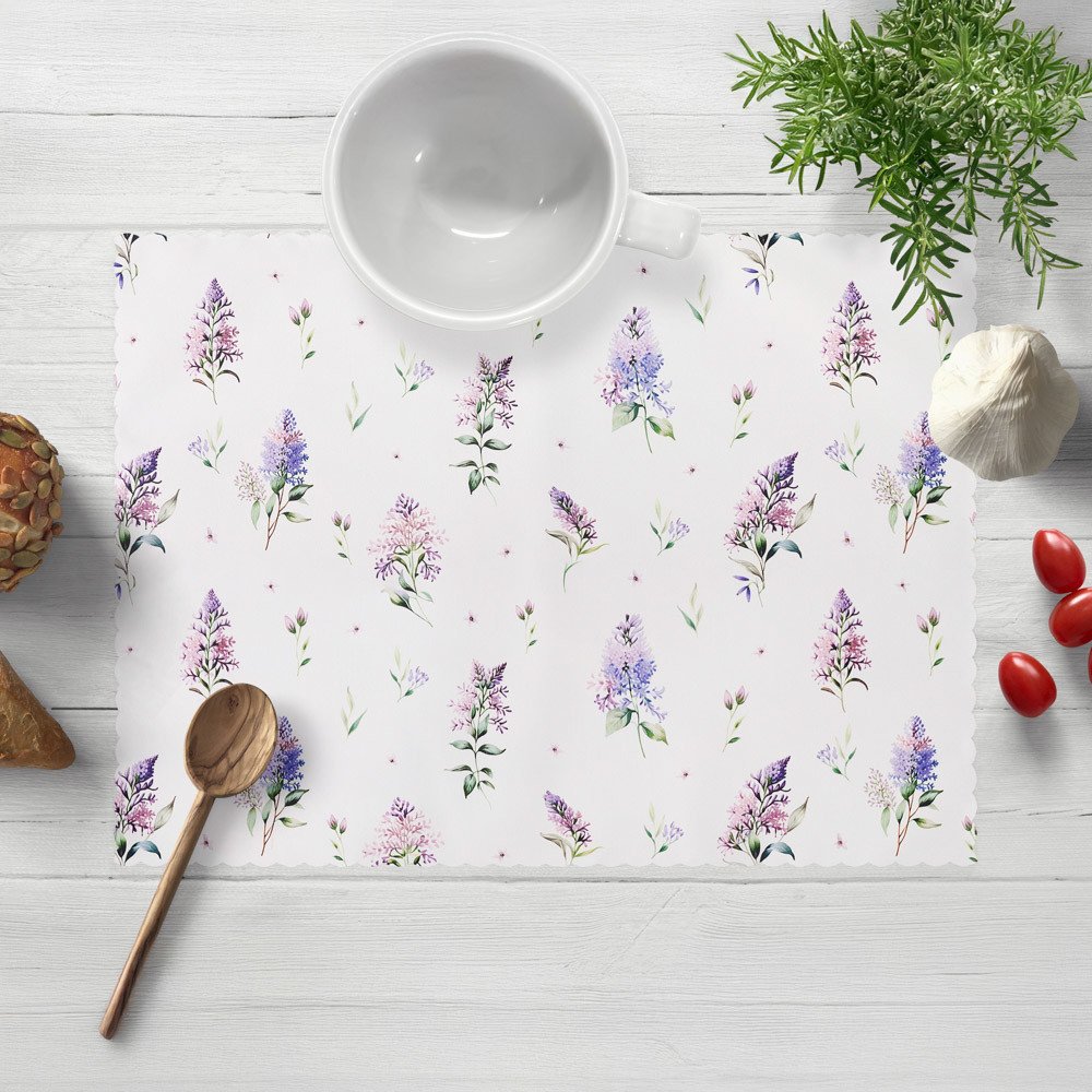 Teflonové prostírání na jídelní stůl, se vzorem šeříků na bílém podkladu, vyrobené ze 100% polyesterové látky s vodoodpudivou a nešpinivou teflonovou úpravou. Je stálobarevné, nesráží se a velmi snadno se udržuje. Okraje prostírání jsou zataveny do tvaru malých obloučků - viz. detailní foto, na přání můžeme obšít klasickým rovným stehem.