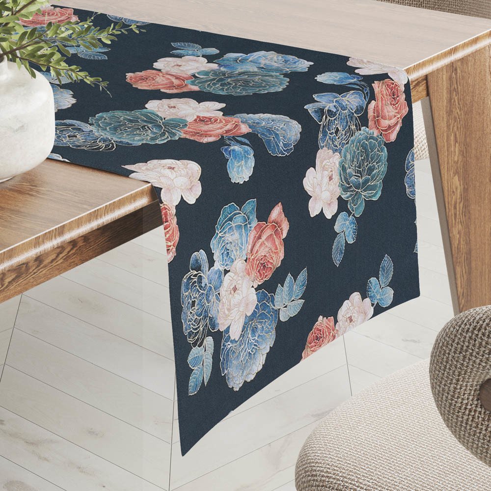 Teflonový běhoun na jídelní stůl se vzorem modrých a červených růží na tmavě modrém podkladu, vyrobený ze 100% polyesterové látky s vodoodpudivou a nešpinivou teflonovou úpravou. Je stálobarevný, nesráží se a velmi snadno se udržuje. Okraje běhounu jsou zataveny do tvaru malých obloučků - viz. detailní foto, na přání můžeme obšít klasickým rovným stehem.