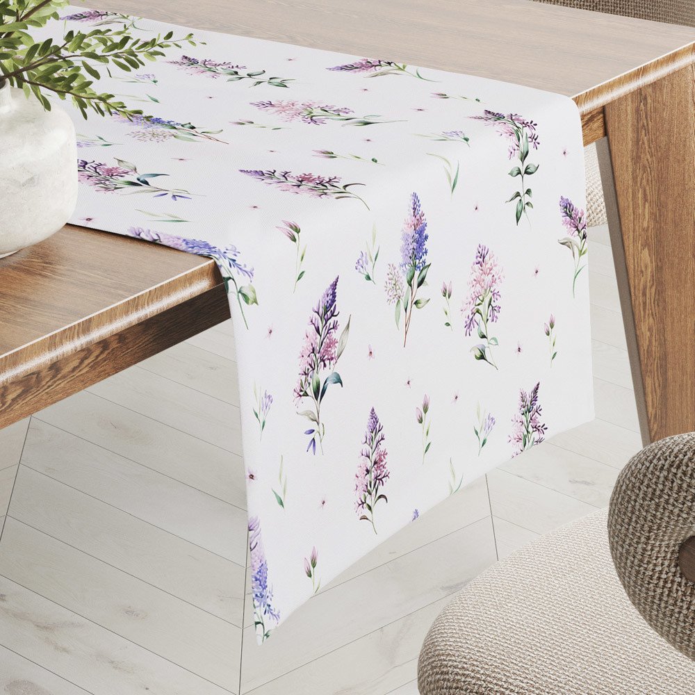 Teflonový běhoun na jídelní stůl se vzorem šeříků na bílém podkladu, vyrobený ze 100% polyesterové látky s vodoodpudivou a nešpinivou teflonovou úpravou. Je stálobarevný, nesráží se a velmi snadno se udržuje. Okraje běhounu jsou zataveny do tvaru malých obloučků - viz. detailní foto, na přání můžeme obšít klasickým rovným stehem.