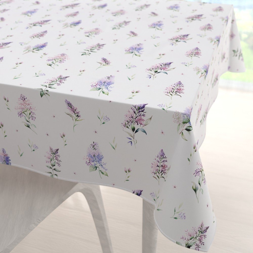 Teflonový čtvercový ubrus na jídelní stůl se vzorem šeříků na bílém podkladu, vyrobený ze 100% polyesterové látky s vodoodpudivou a nešpinivou teflonovou úpravou. Je stálobarevný, nesráží se a velmi snadno se udržuje. Okraje ubrusu jsou zataveny do tvaru malých obloučků - viz. detailní foto, na přání můžeme obšít klasickým rovným stehem.