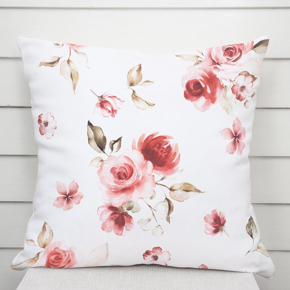 Dekorační povlak na polštář se vzorem červených růží na bílém podkladu, ušitý ze 100% polyesterové látky s vodoodpudivou a nešpinovou teflonovou úpravou. Je stálobarevný, nesráží se a snadno se udržuje. Zapínání na zip je skryté na spodní straně povlaku a neruší tak jeho celkový vzhled.