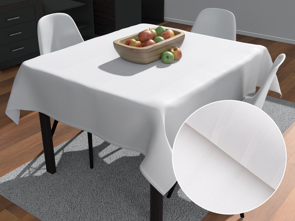 Damaškový bavlněný čtvercový ubrus na velký jídelný stůl, se vzorem střídajících se proužků o šířce 6 a 24 mm. Je ušitý z bílé damaškové látky, tkané z velmi jemných 100% bavlněných česaných vláken, které dodávají látce vysokou pevnost a luxusní lesklý vzhled. Dlouhá životnost materiálu. Gramáž látky cca 150 g/m2. Ubrus dodáváme kompletně obšitý.