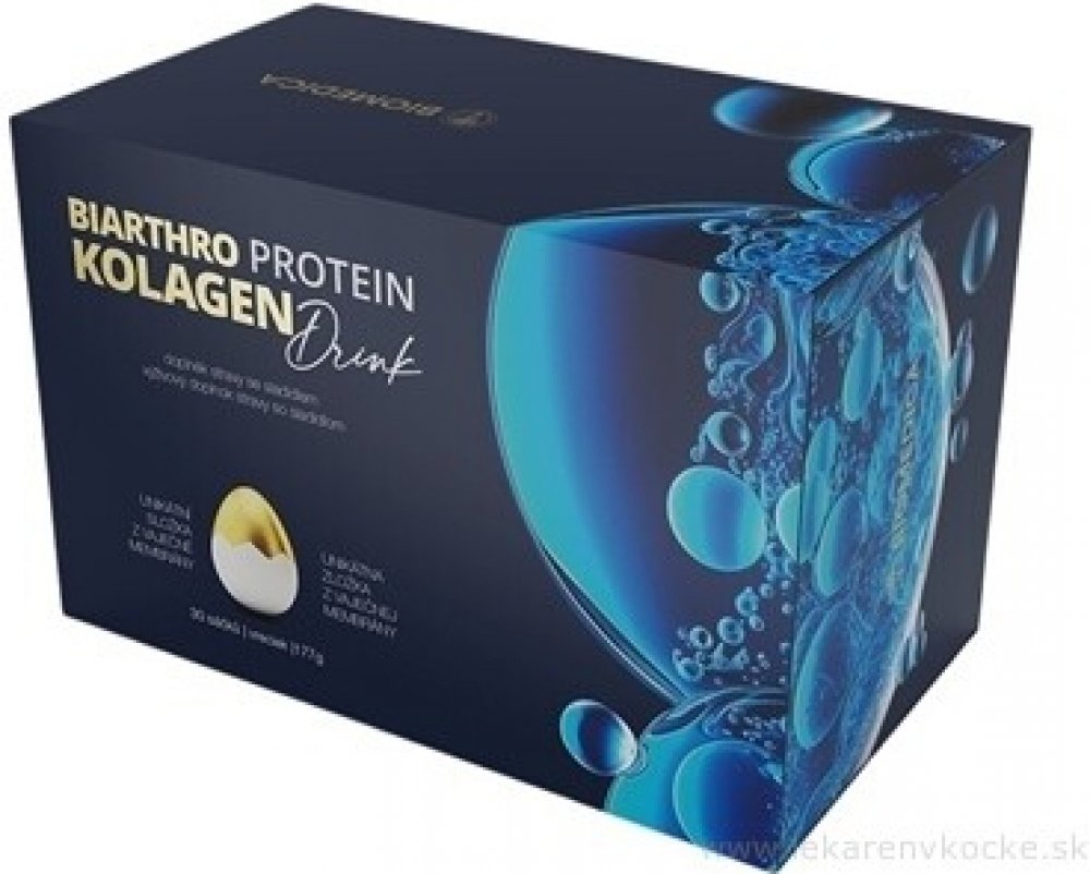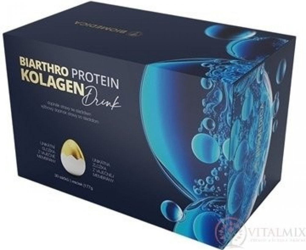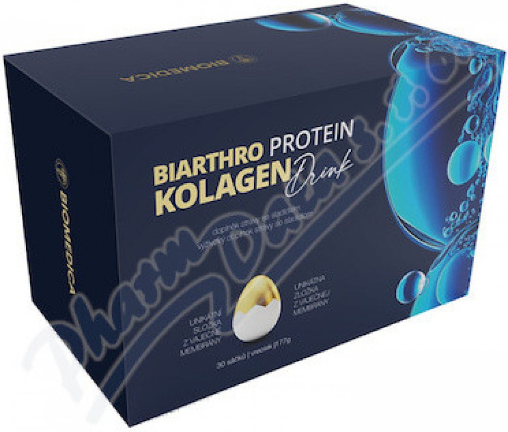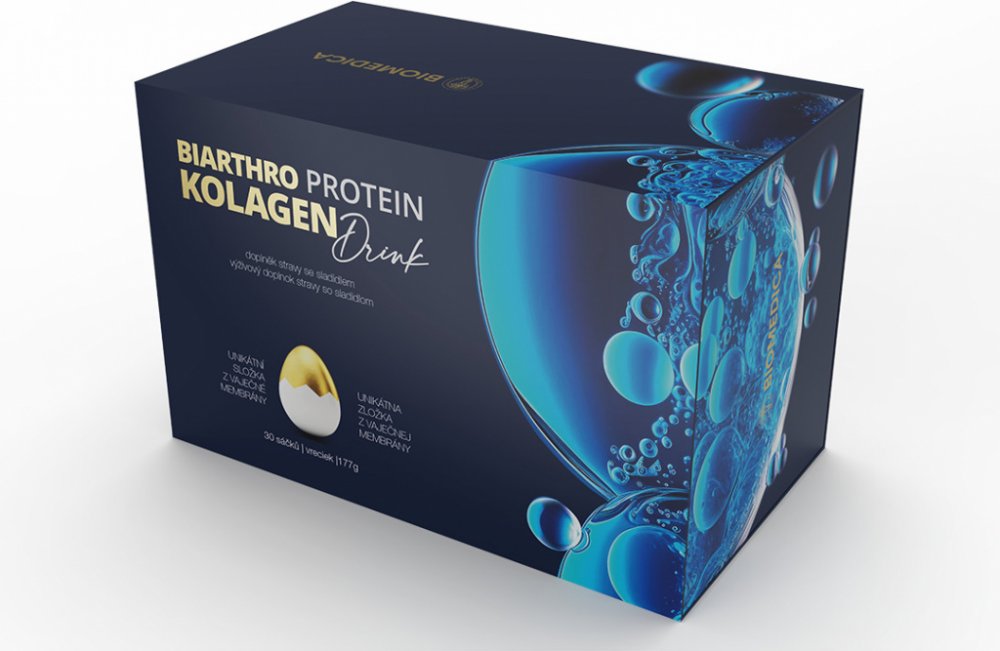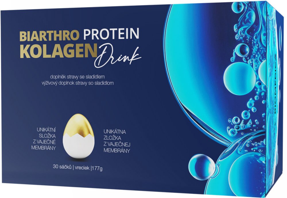 BIARTHRO Protein Kolagen Drink je doplněk stravy se sladidlem, který obsahuje unikátní složku z vaječné membrány, konkrétně extrakt z vaječné membrány. Dále obsahuje rybí kolagen, hyaluronát sodný, D-glukosamin sulfát (z korýšů), vitamin C, který přispívá k normální tvorbě kolagenu pro normální funkci kostí, chrupavek, cév, kůže, zubů a dásní. Hořčík přispívá k normální činnosti svalů ak udržení normálního stavu kostí. Vitamin K, vitamin D3 a vápník přispívají k udržení normálního stavu kostí. S přírodní pomerančovým a citrónovým aroma.