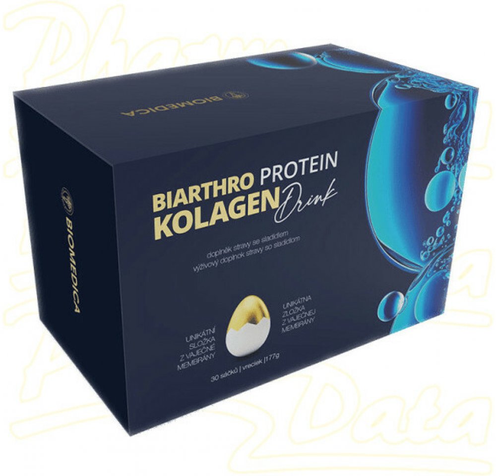 BIARTHRO Protein Kolagen Drink je doplněk stravy se sladidlem, který obsahuje složku z vaječné membrány, konkrétně extrakt z vaječné membrány. Dále obsahuje rybí kolagen, hyaluronát sodný, D-glukosamin sulfát (z korýšů), vitamin C, hořčík, vitamin K, vitamin D3 a vápník.