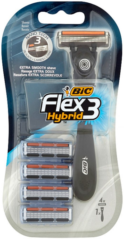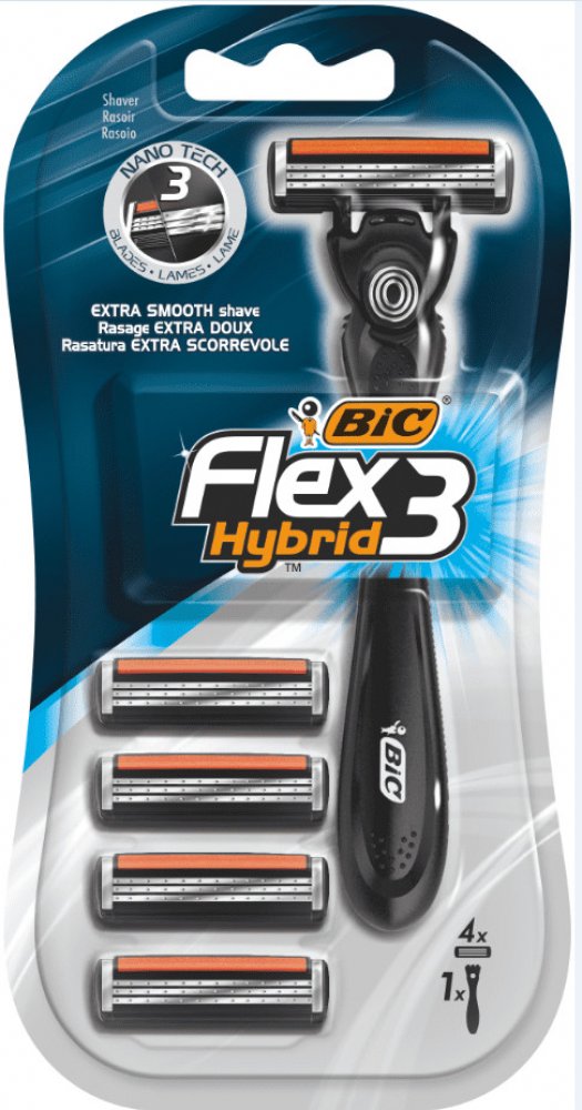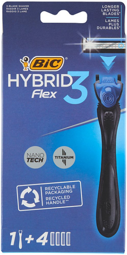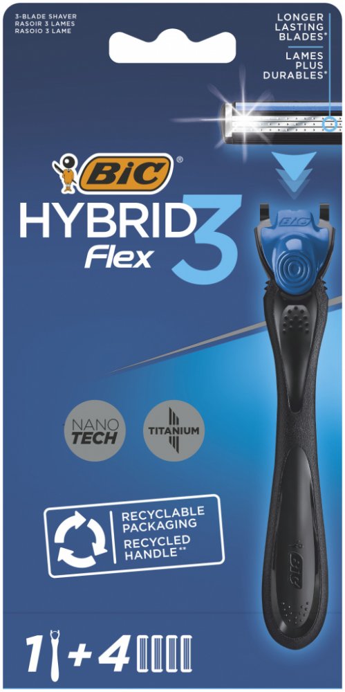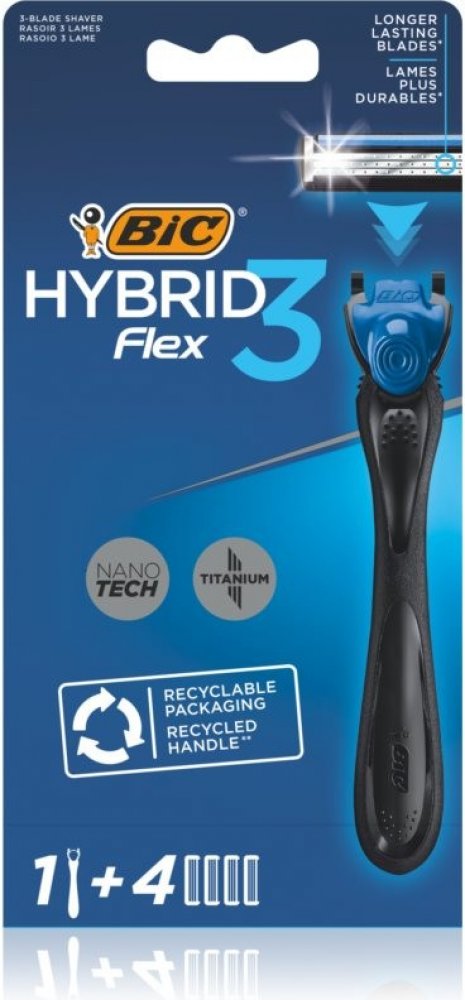 Výhodná ECO sada balení, kdy strojek je vyroben z 90% z recyklovaných plastových materiálů a balení z 80% z recyklovaného papíru a dále recyklovatelné. Sada obsahuje všestranný pánský holicí strojek BIC Flex3 Hybrid s jednou rukojetí a 4 náhradními hlavicemi se třemi odpruženými a pohyblivými břity. Samotné břity byly upraveny pomocí nanotechnologie a díky tomu se lehce přizpůsobí konturám Vašeho obličeje, aby zajistily hladké oholení a snadné opláchnutí břitů. Vaše pokožka navíc ocení zklidňující péči širokého lubrikačního proužku obohaceného o vitamín E a Aloe vera