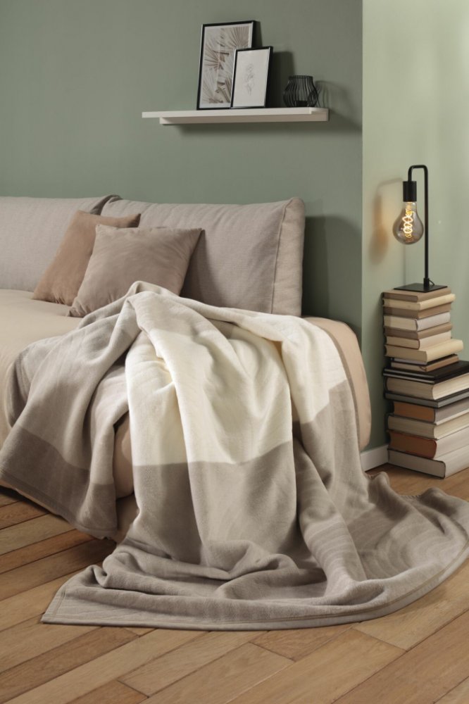 Velikost: 150 x 200 cm Materiál: 58 % bavlna, 35 % polyakryl, 7 % polyester Barva: přírodní odstíny béžové Gramáž: cca 415 g/m² Zakončení: elegantní sametová paspule Vyrobeno v Německu Certifikace: GRS, OEKO-TEX Made in Green