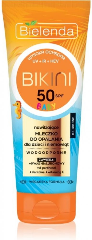 Hydratační opalovací mléko pro děti a kojence Baby BIKINI SPF50. Mléko se rychle vstřebává a může být používáno u kojenců od 6 měsíců věku. Je určen k ochraně citlivé a jemné pokožky, snižuje riziko podráždění a popálenin způsobených sluncem. Produkt obsahuje fotostabilní složení filtrů, které omezují vliv UV + IR + HEV záření na pokožku.