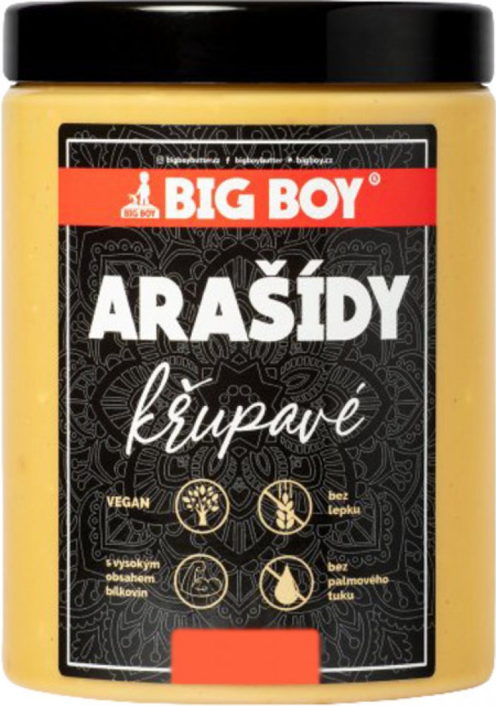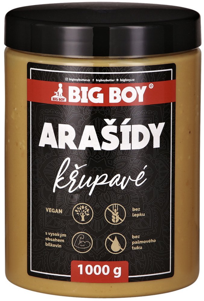 BIG BOY Arašídové máslo s kousky arašídů využijete v kuchyni na spoustu věcí. Kromě toho, že je to super pomazánka a nezbytná přísada do PB&Jelly (oblíbená pochoutka kulturistů), bude se vám hodit i do zdravého pečení nebo při vaření do asijského stir-fry. Případný sediment na povrchu není na závadu, jedná se o přirozený jev. Před konzumací promíchejte.
