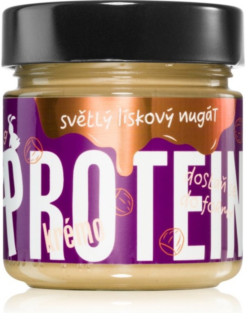Proteinový krém s mléčnou příchutí se sladidlem 80 % (směs rostlinných tuků a olejů: slunečnicový olej, kokosový olej, kakaové máslo, olej světlice barvířské, sladidlo: maltitol, syrovátková směs, sušené odstředěné mléko, slunečnicový lecitin, vanilin), pražená jádra lískových ořechů 20 %.