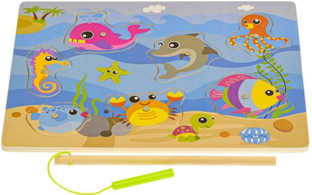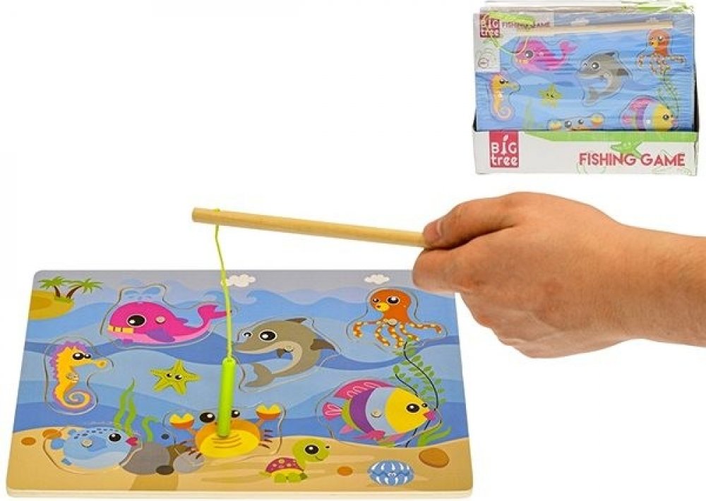 Dřevěný prut s magnetem zavěšeným na provázku, na který se musí nachytat rybičky. Hra rozvíjí dítě ve dvou fázích. Jednak jde o soutěživou hru, kdo naloví pomocí magnetků připevněného na prutu více rybiček a jednak vede dítě k přemýšlení, kdy má za úkol složit rybičky zpět tak, aby zapadaly do do otvoru podle tvaru rybiček.