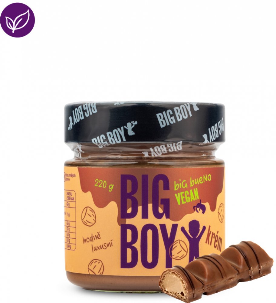 Naše nová verze Big Buena zaručeně potěší všechny vegany. S kokosovým mlékem, bez palmového oleje! V tomhle hodobóžo labůžo krémíku na tebe čekají pečlivě vybrané nasucho pražené lískáče (50 %) nebo třtinový cukr. Jsme moc rádi, že můžeme bigboy fajnšmekry prověřenou dobrotu naservírovat nově i všem veganům. Tak směle do toho, tvoje chuťové pohárky už se těší na zbrusu novou jízdu!