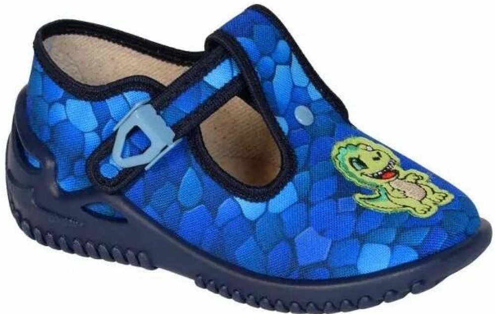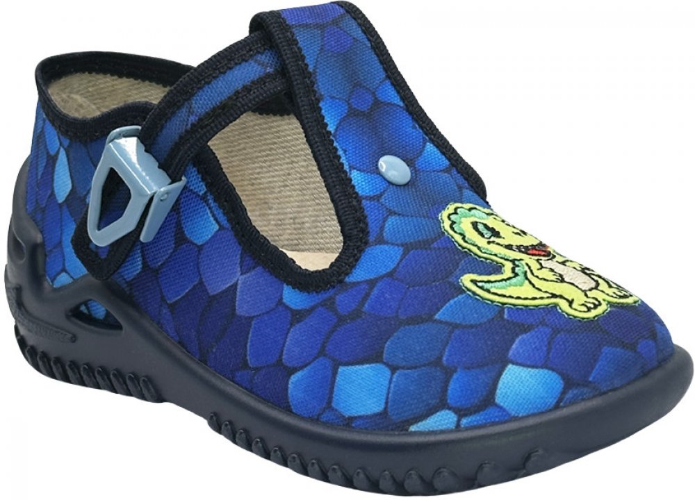 Dětské bačkory Bighorn Filip se zapínáním na přezku a plnou špičkou. Materiál je vysoce kvalitní bavlna v modrém provedení s obrázkem dinosaura. Lehká pružná podešev vyrobená z PVC. Stélka je vyrobena z přírodní kůže a pružné pěny s aktivním uhlím. Kůže absorbuje přebytečnou vlhkost a aktivní uhlí nepříjemné pachy, c...