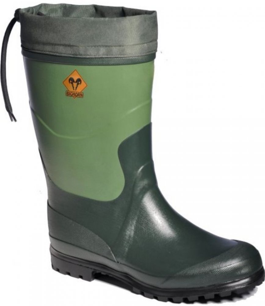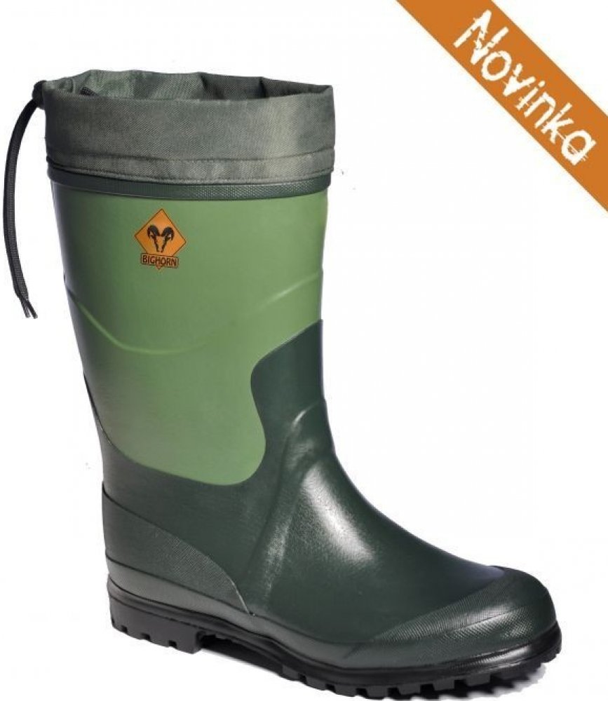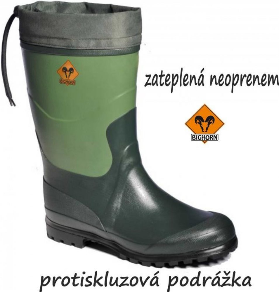 Zateplené gumové holinky bighorn VERMONT NEO jsou ideálním řešením pro deštivé a chladné počasí. Barva holinek je zelená. Boty jsou vhodné zejména pro volný čas a myslivost. Mají hrubší protiskluzovou podrážku zajišťující bezpečnost chůze. Holinky jsou velice pohodlné. Materiál je vysoce kvalitní guma zateplená neoprenem. Na svršku je zatahovací nástavec na tkaničku proti padání nečistit do holinky. Poskytují vynikající uživatelský komfort a to i při nízkých teplotách (materiál testován do - 15°C).