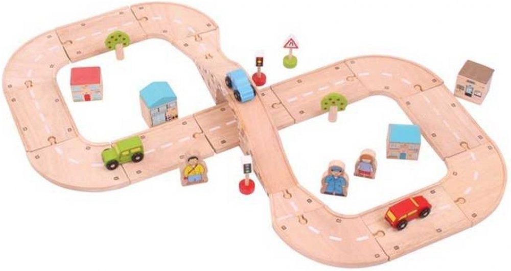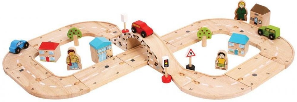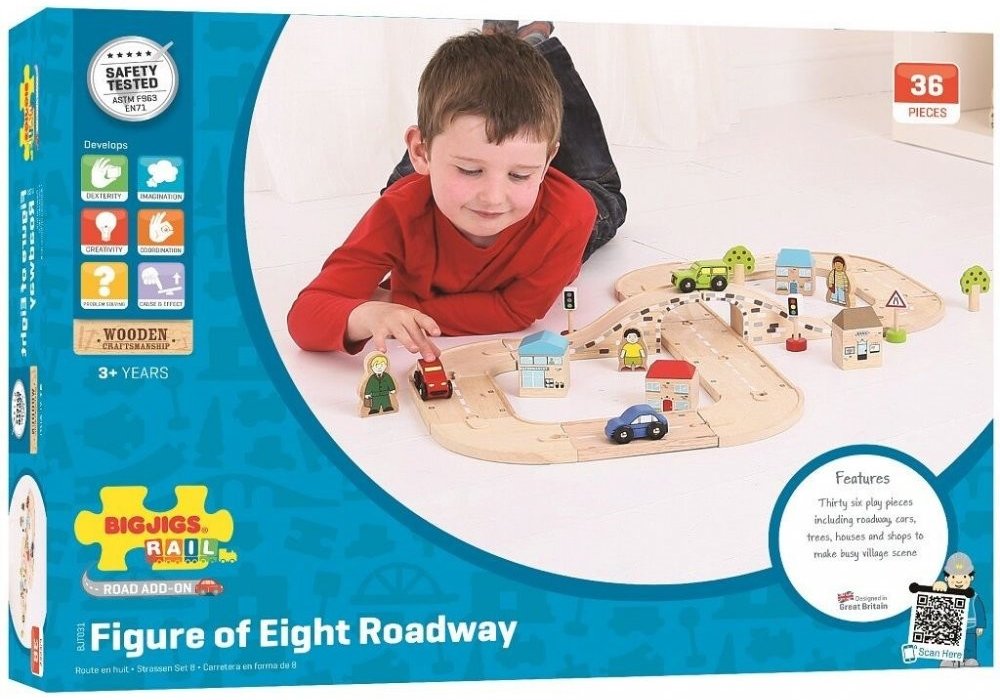 Tato fantastická sada osmička je ideální dárek pro vaše dítě. Obsahuje řadu dřevěných silníčních dílů a příslušenství, což umožňuje dostatek prostoru pro delší hru. Může být použita s jinými herními sety vláčkodráh Bigjigs Rail a tím i rozšířit různé herní aktivity. Ideální pro zvýšení zručnosti a koordinace dítěte.