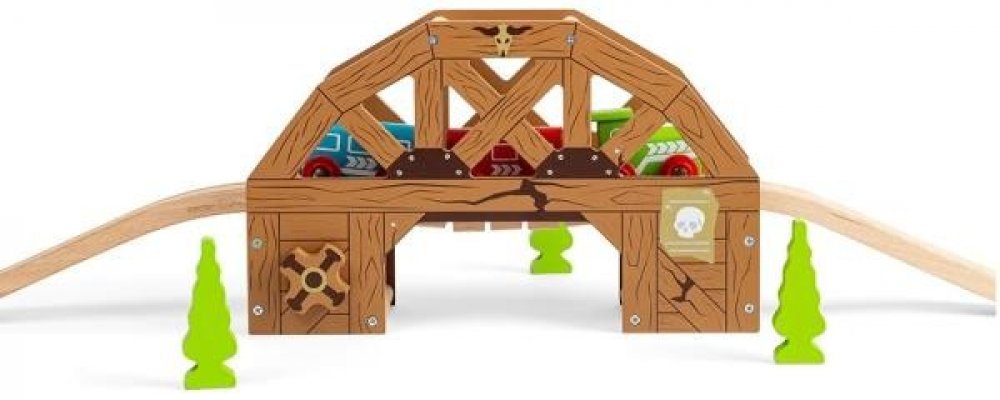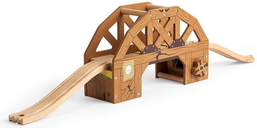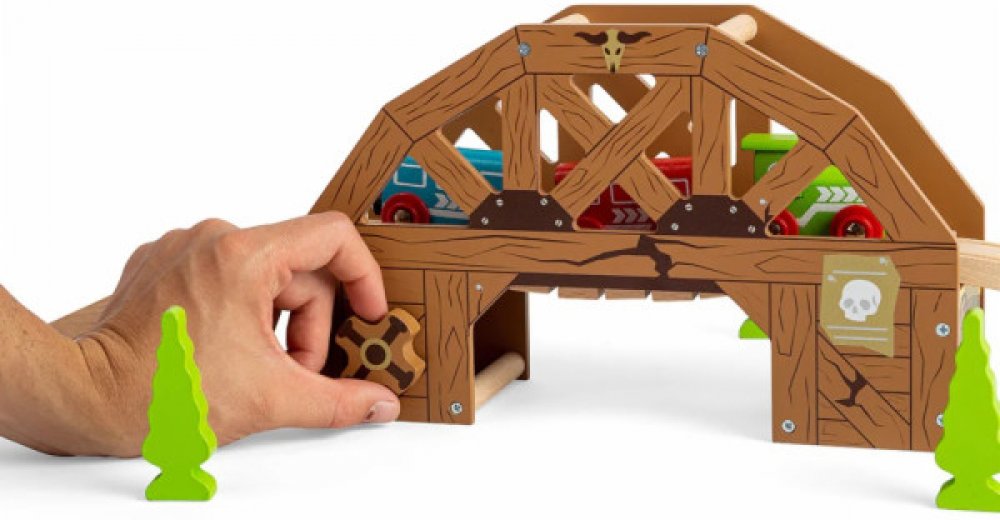 Kovbojové a kovbojky si užijí spoustu zábavy s tímto dřevěným mostem v tématice divokého západu. Vlaky vyjdou na most, ale dostanou se bezpečně na druhou stranu? Otočte kolem a most spadne! Interaktivní doplněk vláčkodráhy pro všechny vlakové nadšence. Hraní s vláčkem a otáčení kola rozvine dětskou motoriku a koordinaci ruka-oko. Obsahuje dva kusy stoupající a klesající koleje. Vláčkodráhy a jejic...