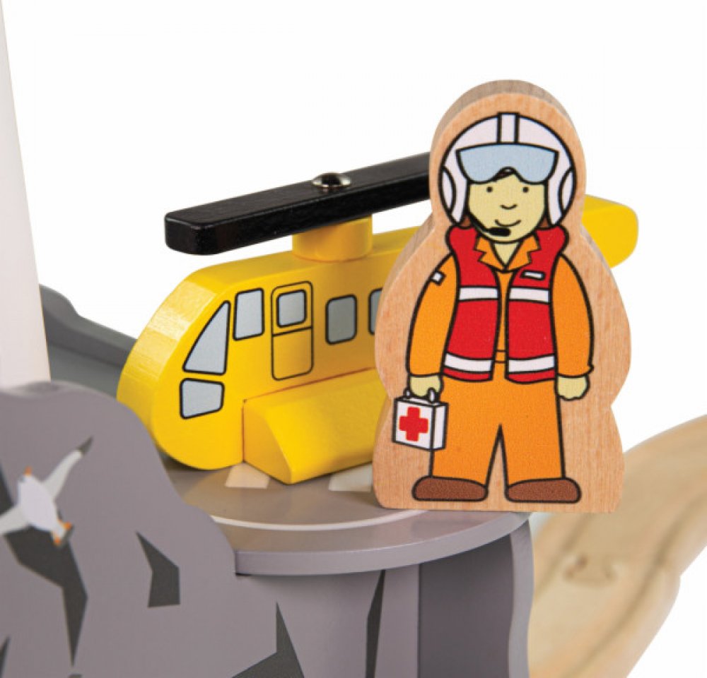 Zábavný doplněk každé dřevěné vlakové soupravy a skvělý způsob rozšíření vláčkodráhy. Projíždějte tunelem v pobřežním skalisku obklopeném racky a stráženém majákem, díky němuž jej bezpečně obeplouvají lodě. Strážce majáku má zodpovědnou práci, proto potřebuje mít kde i odpočívat, pro všechny případy je mu navíc k ruce i helikoptéra se zdravotníkem. Lze s nimi podnikat pátrací a záchranné mise, neb...