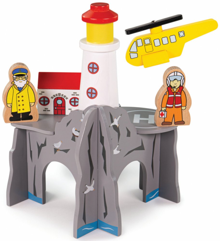 Zábavný doplněk každé dřevěné vlakové soupravy a skvělý způsob rozšíření vláčkodráhy. Projíždějte tunelem v pobřežním skalisku obklopeném racky a stráženém majákem, díky němuž jej bezpečně obeplouvají lodě. Strážce majáku má zodpovědnou práci, proto potřebuje mít kde i odpočívat, pro všechny případy je mu navíc k ruce i helikoptéra se zdravotníkem. Lze s nimi podnikat pátrací a záchranné mise, nebo i jiná rozmanitá dobrodružství rozvíjející fantazii Vašich dětí. Nápadité rozšíření Vaší vláčkodráhy skýtá moře zábavy a je zvláště vhodné k doplnění soupravy Úklid pobřeží. Vyrobeno z vysoce kvalitního, odpovědně získaného dřeva ošetřeného nezávadnými barvami a laky.