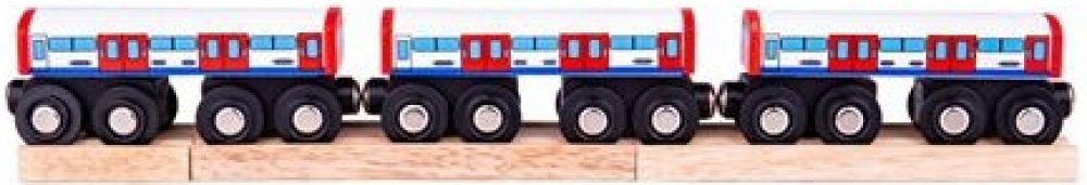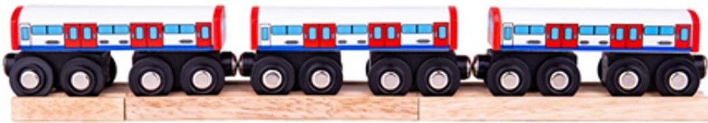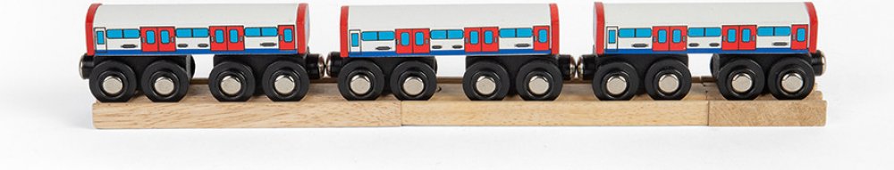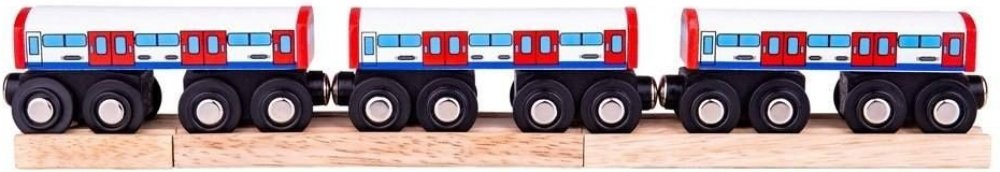 Přijíždí souprava metra! Do které stanice máte namířeno? Vagóny metra jsou dřevěnou replikou ikonické londýnské soupravy metra, která převáží nejen turistky, ale taky Londýňany. Pěkný doplněk jakéhokoliv setu dřevěných vláčků. Balení obsahuje 3 vagónky a 3 kusy dřevěných kolejí. Hlavní vlastnosti: