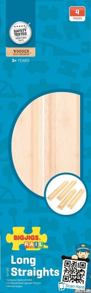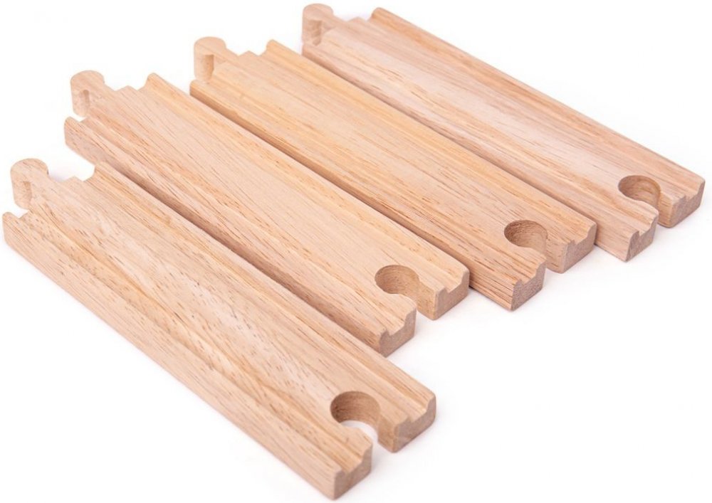 Toto balení obsahuje 4 dlouhé rovinky z BigJigs dřevěného železničního sortimentu. Vyrobeny jsou z kvalitního tvrdého dřeva a jsou kompatibilní s dalsími dřevěnými železničními systémy našich vláčkodrách. Tyto koleje mohou být skvělým přírustkem do vaší sbírky železnic.