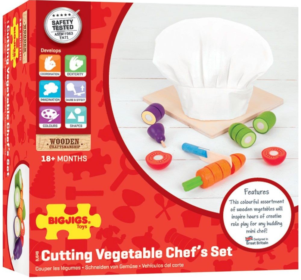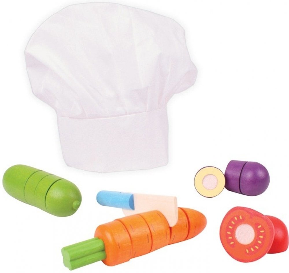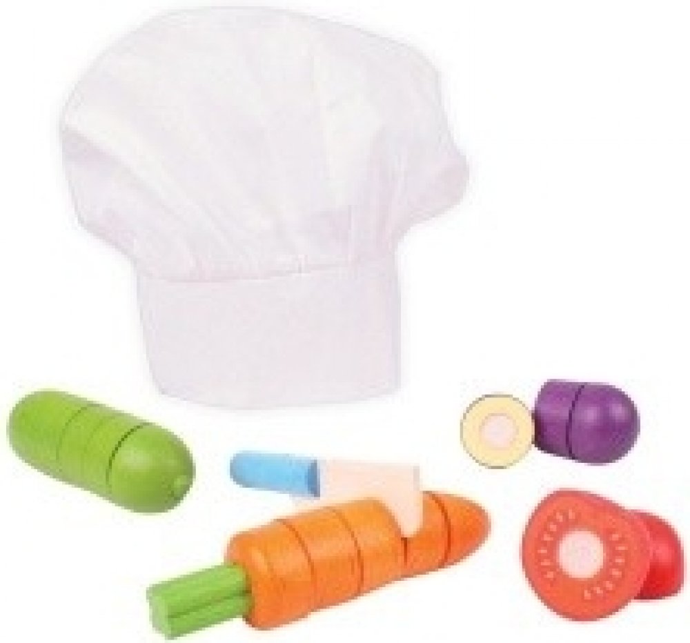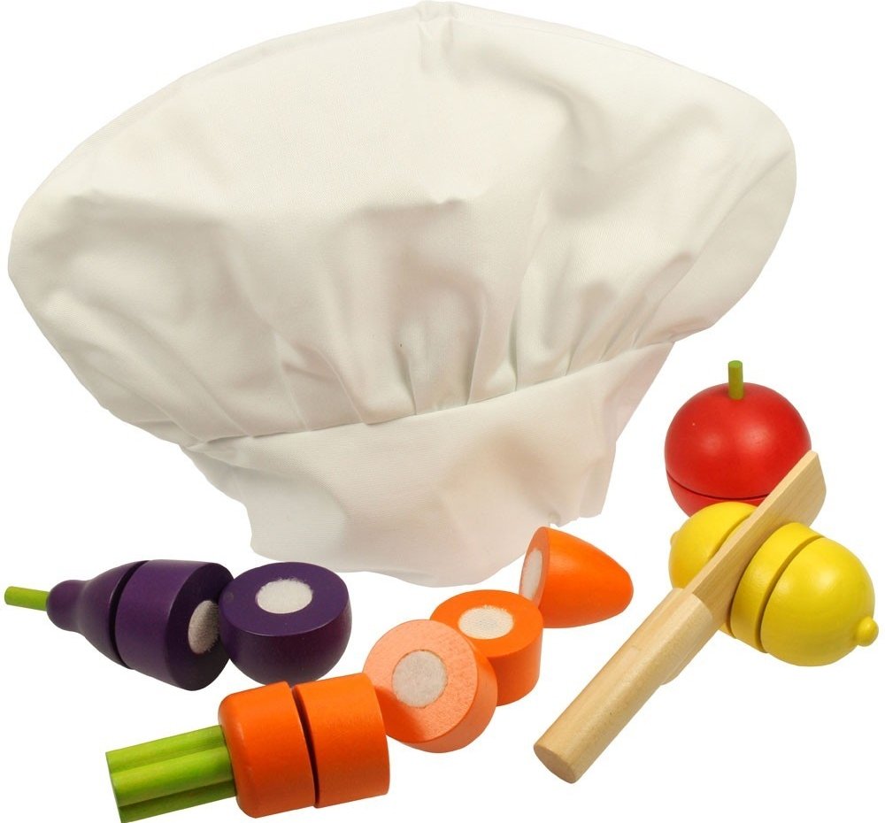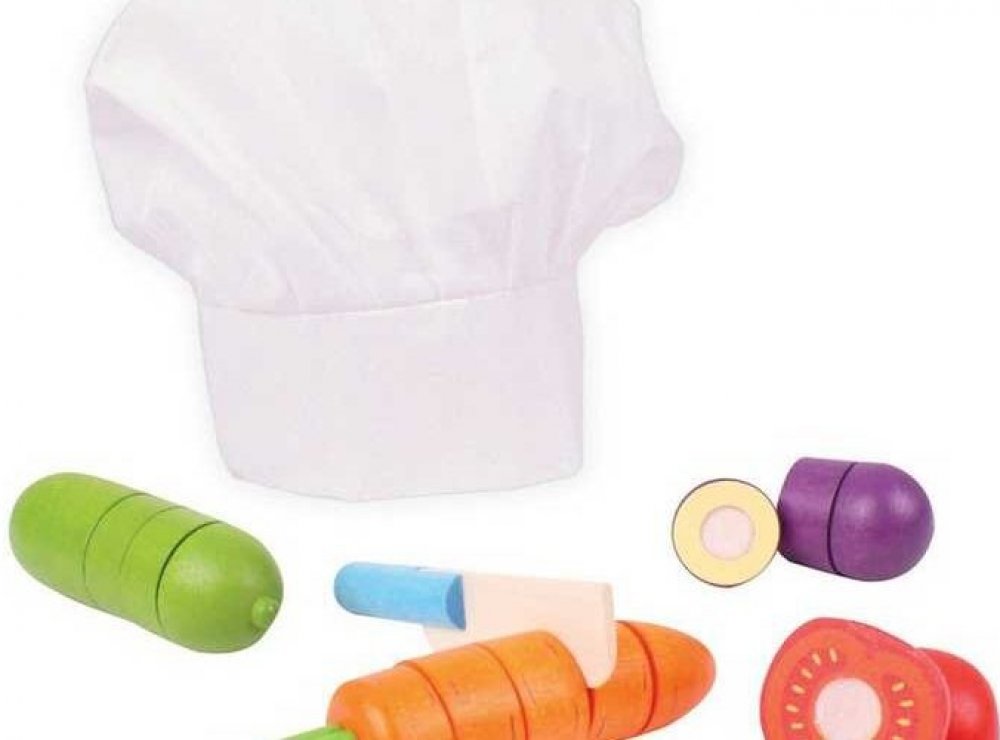 Tento výběr pestrobarevných zeleninových plodů lze pečlivě a přesně nakrájet pomocí dřevěného nože. Skvělý způsob, jak se dozvědět o bezpečnosti v kuchyni. Obsahuje bílou kuchařskou čepici, která napomáhá nápadité hře. Dřevěné hrací potraviny jsou ideální k tomu, aby vašemu nejmenšímu pomohlo dozvědět se o důležitosti zdravé a vyvážené stravy, o tom, odkud naše jídlo pochází a jak se připravuje. V...
