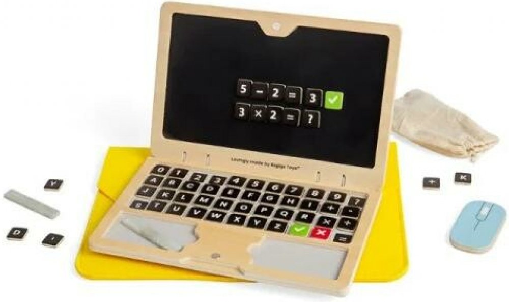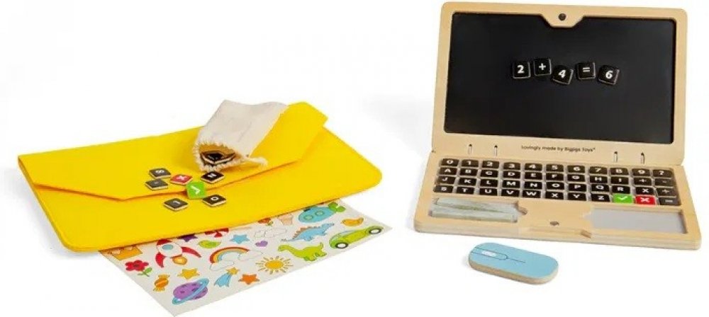 Počítejte, pište, čtěte a učte se hrou s dřevěným notebookem! Na magnetické obrazovce notebooku si děti mohou pomocí magnetických písmen, číslic a symbolů sestavovat slova nebo procvičovat matematiku. Nebo psát na tabuli křídou, kterou snadno odstraní pomocí gumové myši. Děti si mohou notebook ozdobit pomocí přiložené sady samolepek a na cestování vložit do praktického pouzdra.