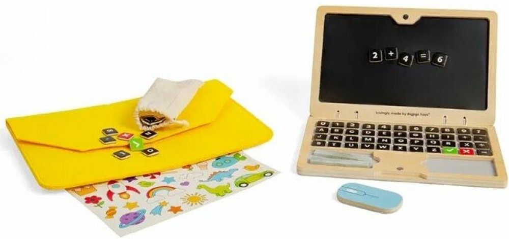 Počítejte, pište, čtěte a učte se hrou s dřevěným notebookem! Na magnetické obrazovce notebooku si děti mohou pomocí magnetických písmen, číslic a symbolů sestavovat slova či procvičovat matematiku. Anebo psát na tabuli křídou, kterou snadno odstraní pomoci myši s gumou. Děti si mohou notebook ozdobit pomocí přiložené sady samolepek a na cestování vložit do praktického pouzdra. Počítačové hračky b...