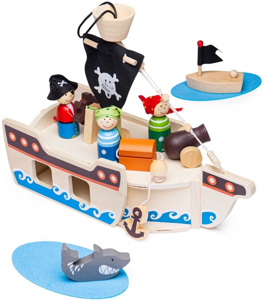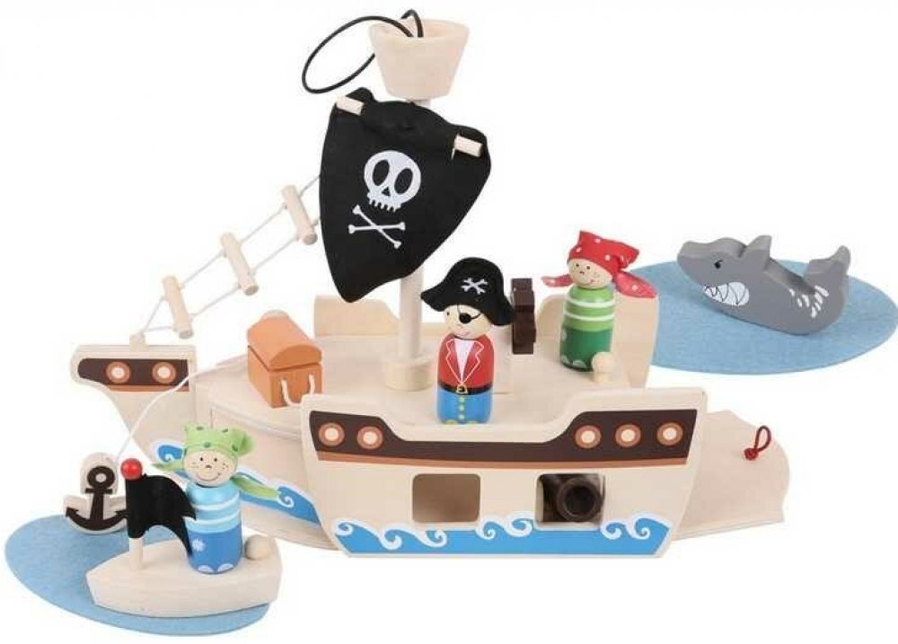 Dětští námořníci budou zbožňovat tento nádherně vytvořený dřevěný pirátský lodní set, kompletní s kapitánem, piráty, truhlou s pokladem a dokonce i žralokem!