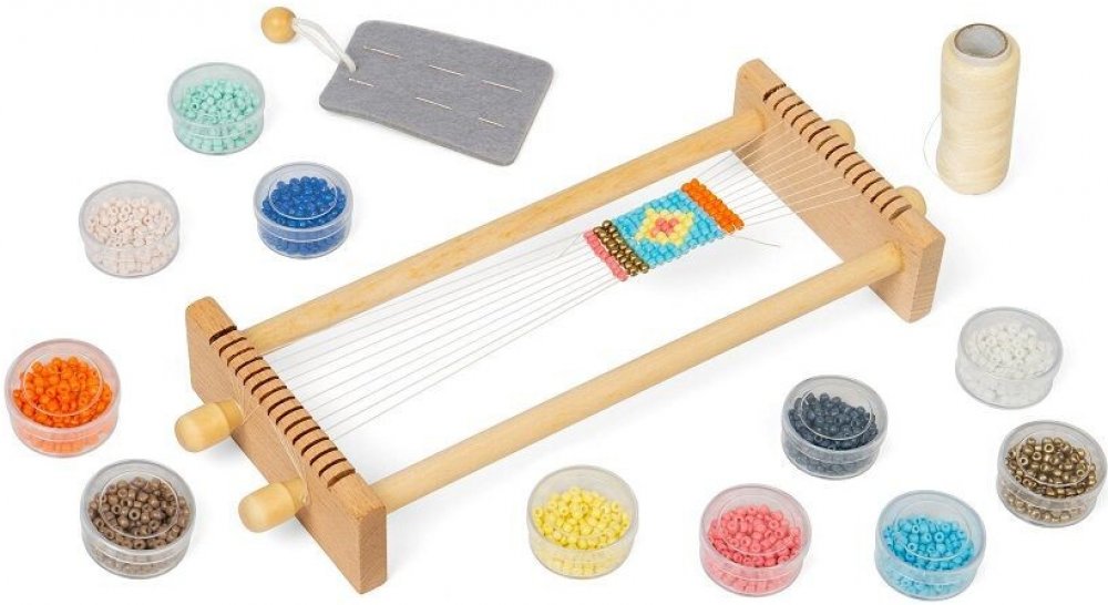 Kreativní mládež si zamiluje tento tradiční dřevěný tkalcovský stav na korálky. Vyrobte si své jedinečné šperky nebo dekorativní vzory. Na výběr je 12 barev korálků. Dřevěný tkalcovský stav je robustní a zároveň ideální velikosti pro malé ručičky. Pomáhá rozvíjet jemné motorické dovednosti, kreativitu, soustředění a trpělivost.