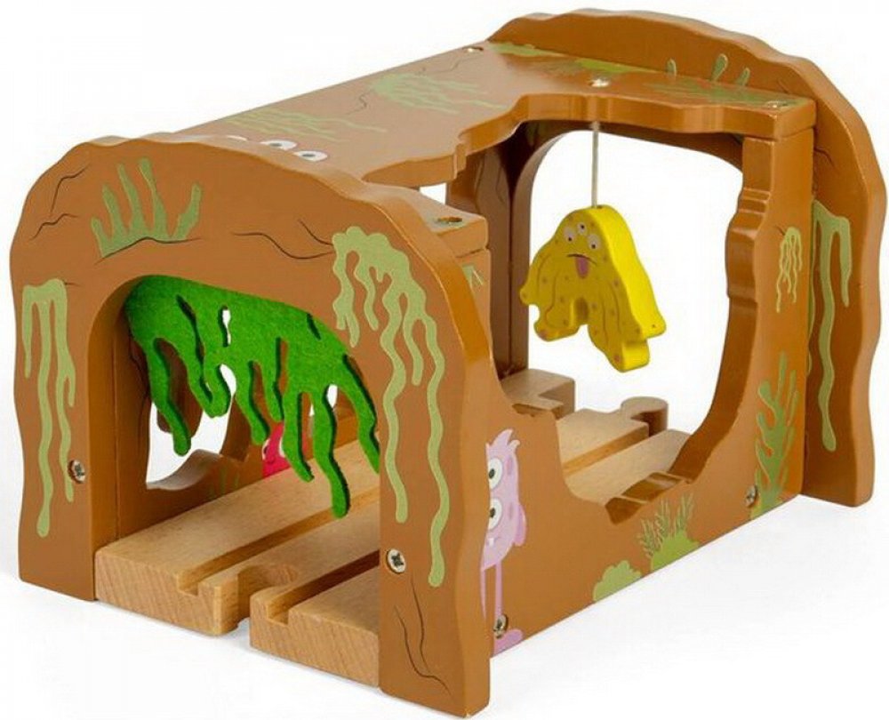 Dřevěný železniční tunel k vláčkodráze. Vláček musí projet tunelem vyzdobeným obrázky pod zavěšenou žlutou příšerou na jedné a plstěným slizem na druhé straně. Strašidelný tunel je zábavný doplněk k vláčkodráze Příšerky. Cca 15cm hluboký a dostatečně vysoký pro projetí malých i větších mašinek. Tunel lehce zapojíte do hry klasickým připojením vstupu a výstupu.