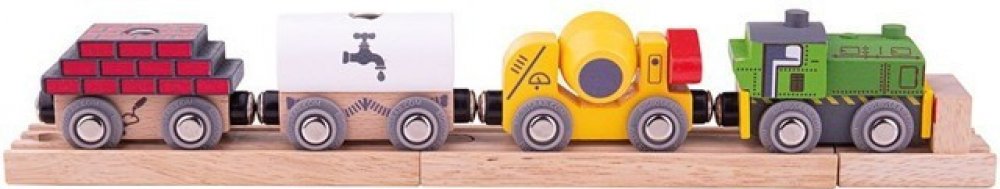 Dřevěný vláček se stavebními vagonky. Vlak má mašinku a tři vagónky - s cementem, cihlami a cisternou. Vagónky a mašinka se připojují pomocí magnetů. Pro větší zábavu se dá zboží z jednotlivých vagónků vyjmout. Součástí jsou 3 koleje v délce 2x14cm a koncový nárazník 5cm. Celková délka vláčku je 32cm.