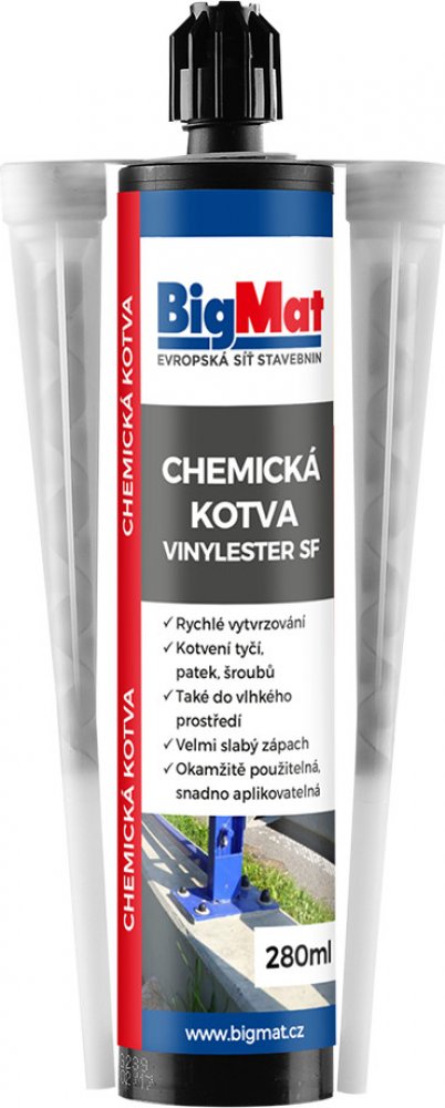 Kotva chemická Vinylester SF BigMat - silné a spolehlivé uchycení. Vysoce výkonný dvousložkový chemický kotevní systém na bázi vinylesterové pryskyřice s nízkým zápachem. Rychle tuhne a vytváří pevné, odolné a chemicky stabilní spojení. Ideální pro kotvení do betonu, kamene, zdiva i dalších materiálů.