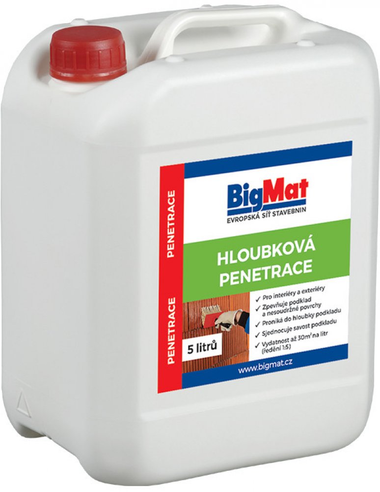 Penetrace hloubková BigMat - snadné zpevnění a sjednocení podkladu. Vysoce účinná jednosložková penetrace na savé podklady, která zajišťuje dokonalé kotvení a zpevnění. Vodou ředitelná kompozice na bázi styren-akrylátového kopolymeru optimalizuje savost podkladu a vytváří ideální adhezní můstek pro následné vrstvy. Vhodná pro beton, anhydrit, omítky, zdivo, sádrokarton a další minerální povrchy.