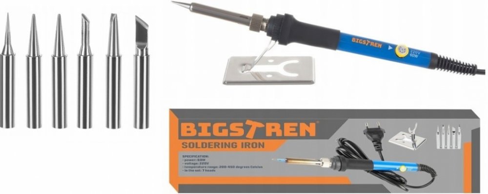 PÁJKA + 6 HROTŮ + STOJANVČETNĚ STOJANU NA HORKOU PÁJKU - s lehkým a praktickým, pohodlným železným podstavcem. Díky tomu můžete páječku odložit a odpočinout si od práce nebo ji nechat vychladnout. Stojan je velmi stabilní - sám se nepřevrhne.ŠIROKÁ ŠKÁLA APLIKACE + AŽ 6 HROTŮ - ideální pro pájení všech druhů malých a středně velkých součástek. Díky přiloženým 6 různým tipům pájecí hrot rychle přizpůsobíte aktuální práci.NAŘÍZENÍ TEPLOTY - má regulaci teploty od 200 do 450 °C a vysoký výkon způsobuje rychlé zahřátí. To umožňuje rychlejší zahájení pájení nebo odpájení dílů.PRO KUTILY I PROFESIONÁLY - svůj úkol splní jak doma, tak v profesionálním prostředí. Solidní zpracování a dobře vyvážená struktura zajišťují vysoký pracovní komfort.Má přídavné otočné tlačítko pro regulaci teploty - díky kterému přesně přizpůsobíte teplotu svým aktuálním potřebám. Dalších 6 hrotů vám zajistí pohodlnou práci s různými materiály. Kompaktní pouzdro páječky je odolné vůči vysokým teplotám. Sada obsahuje také stojánek na horkou pájku. Výrobek má přídavné otočné tlačítko pro regulaci teploty - díky kterému přesně přizpůsobíte teplotu svým aktuálním potřebám. Dalších 6 hrotů vám zajistí pohodlnou práci s různými materiály.Specifikace:napájecí napětí: 220V výkon: 60W doba zahřívání: 20s regulace teploty od 200 do 450 °C délka napájecího kabelu: 110 cm knoflík pro nastavení teploty keramický ohřívač rozměry: 22,5 x 2,5 cm hmotnost: 0,101 kg