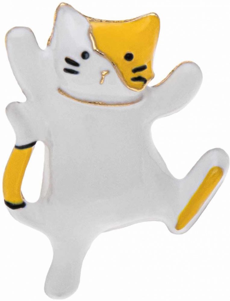 Roztomilá brož ve tvaru tancující kočičky v bílé barvě se žlutými detaily a černými linkami. Ideální doplněk pro milovníky koček, který dodá outfitu hravý a veselý nádech.