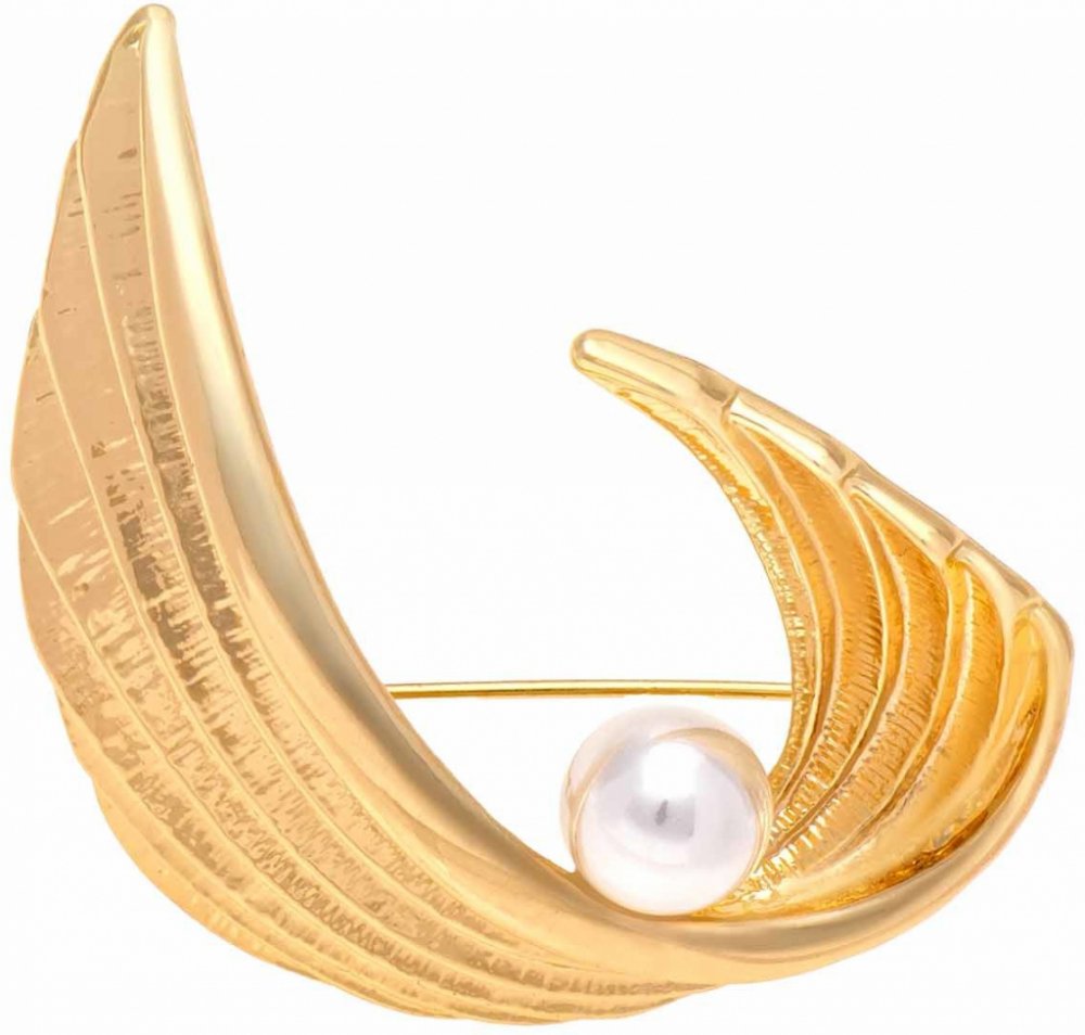 Tato elegantní brož ve tvaru stylizovaného křídla v lesklém zlatém provedení zaujme svým ladným tvarem a jemnou perličkou uprostřed. Symbol ochrany a elegance je skvělým doplňkem ke slavnostnímu i každodennímu outfitu. Vyrobena z bižuterního kovu a opatřena brožovou sponou pro snadné připnutí.