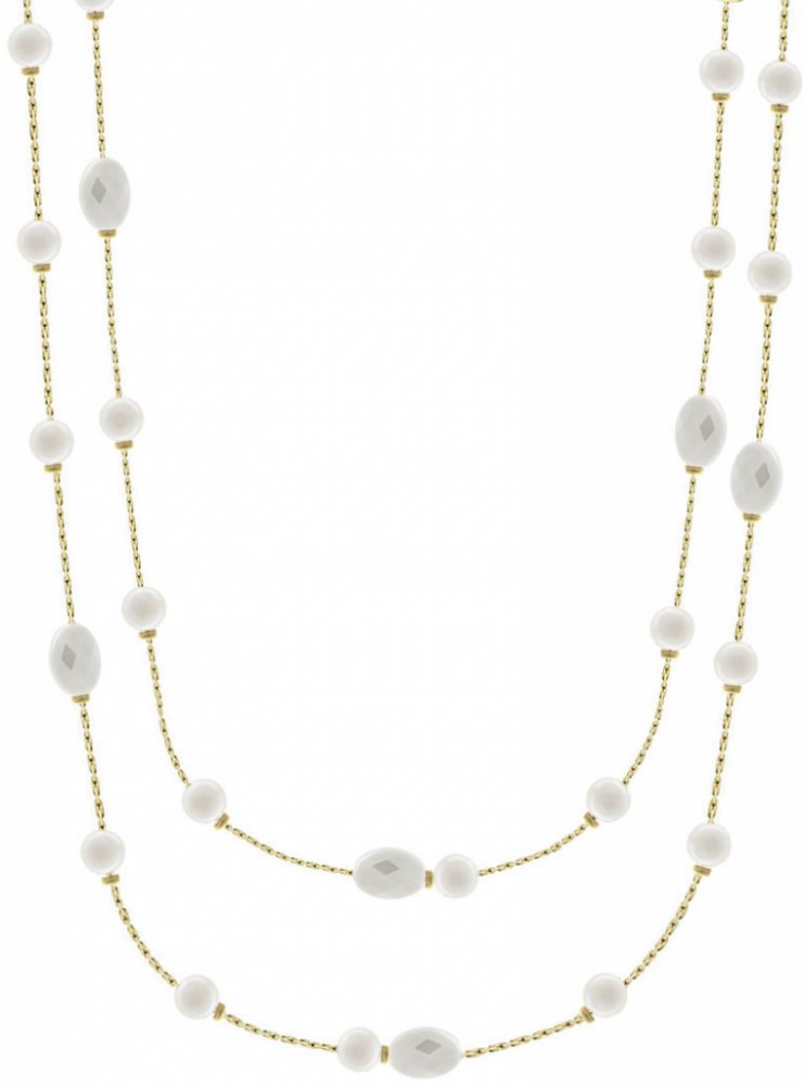 Elegantní dvouřadý náhrdelník v jemném designu spojuje lesk bílých perliček a broušených oválných korálků s decentním zlatým řetízkem. Minimalistický, přesto výrazný doplněk, který rozzáří každodenní outfit i slavnostní šaty. Díky neutrální bílé barvě se skvěle kombinuje s různými styly a barvami oblečení.